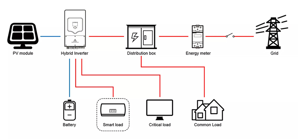 Hybrid Storage Inverter is the heart of energy storage solar system, which converts DC power from solar modules into AC power, and control battery charge&discharge.